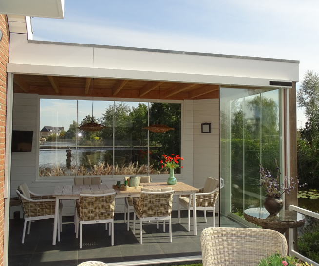 Tot slot is de bestaande overkapping verbouwd tot een volwaardige tuinkamer met glazen schuifwanden: een fijne plek waar je in het voor- en najaar heerlijk kunt zitten.